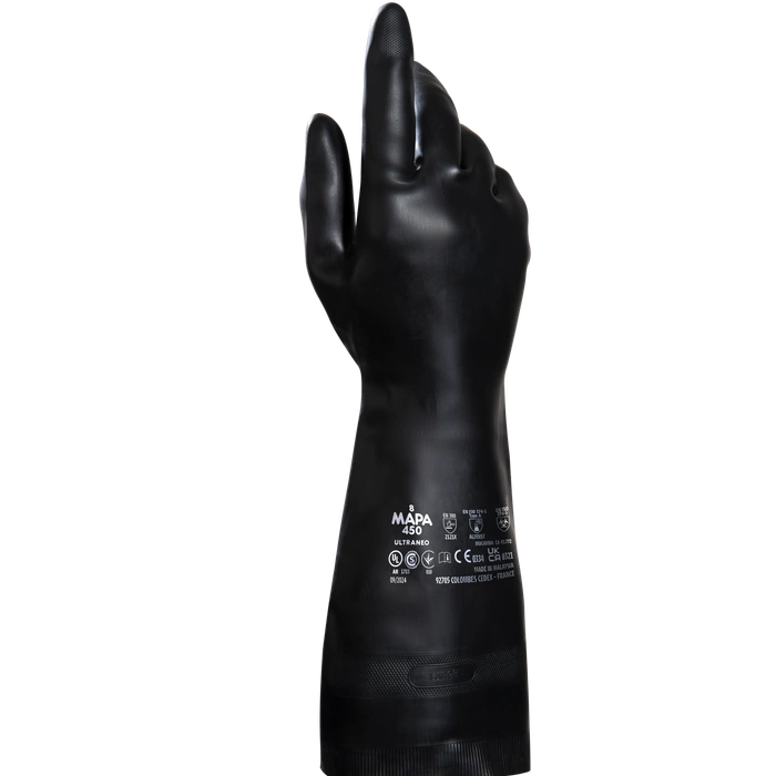 MAPA UltraNeo 450/420 Chloroprene Rubber Chemical Resistant Gloves – 16″/12” Heavy Duty, Acid Alkali Solvent Proof, Type A, 0.78mm Thickness (Multi-Purpose, Splash Protection)